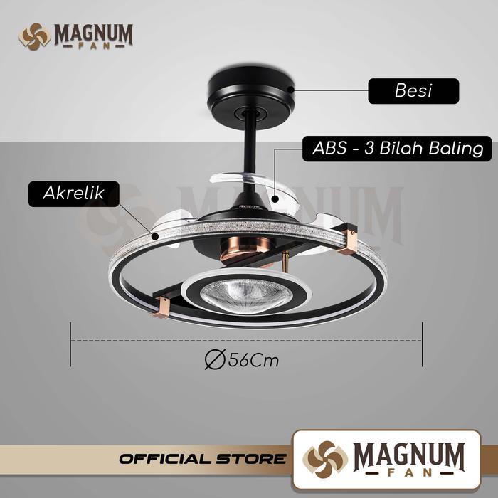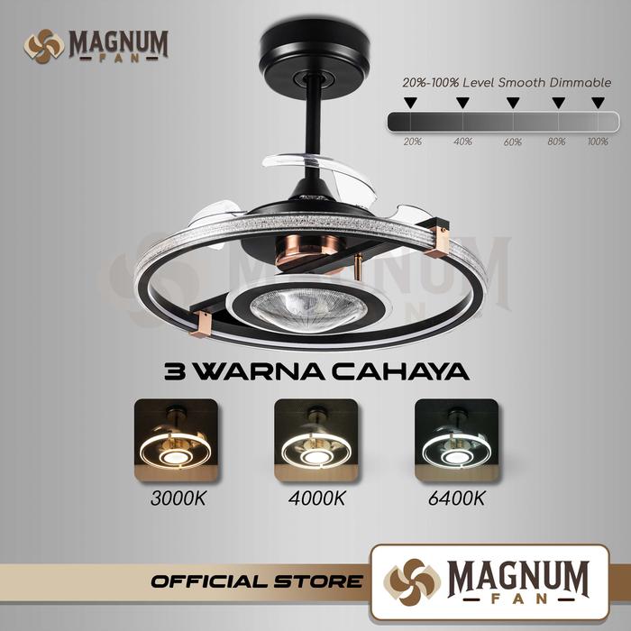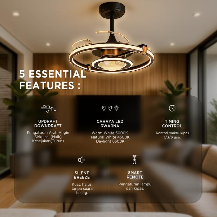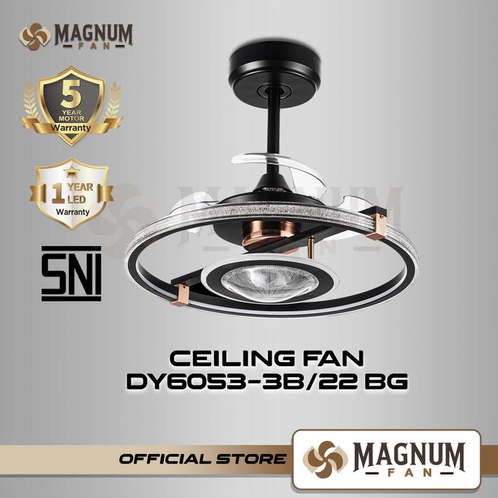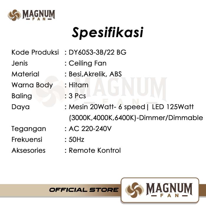 Kipas plafon modern ini menawarkan pencahayaan 3 warna yang elegan. Dengan desain modern, kipas ini cocok untuk berbagai interior. Kode produk: DY6055-3B/22 BG. Terbuat dari besi, akrilik, dan ABS, dengan body hitam. Dilengkapi 3 baling. Daya mesin 20Watt dengan 6 kecepatan, LED 125Watt (3000K, 4000K, 6400K). Dimmer/Dimmable memungkinkan penyesuaian cahaya sesuai kebutuhan.